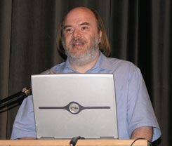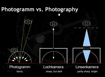 Die Methode der Strahlenverfolgung gewährte auch eine interessante „holistische“ Perspektive auf das Photogramm. In einem Diagramm stellte Philipp Slusallek die unterschiedlichen Strahlenwege im Photogramm und in einer Loch- und Linsenkamera gegenüber. Beim Photogramm verdeutlichte die Graphik, daß die lichtempfindliche Oberfläche aus allen Richtungen kommende Lichtstrahlen registriert. Es wurde somit offensichtlich, daß nur die nahen Objekte klar wieder gegeben werden können, da mit zunehmender Entfernung der Objekte die globale Lichtsituation immer dominanter wird. Für Philipp Slusallek war deshalb auch klar, warum auf den Celestographien Strindbergs nichts zu sehen ist: Schließlich kommt auf dem Photopapier nicht nur der Lichtstrahl eines bestimmten Sterns an, sondern jeweils das Licht des gesamten Firmaments. Demgegenüber vermögen Kameras mit einer Lochblende oder einer Linse, die Strahlen, die aus einer bestimmten Richtung kommen, zu selektieren, bzw. sogar noch zu verstärken.